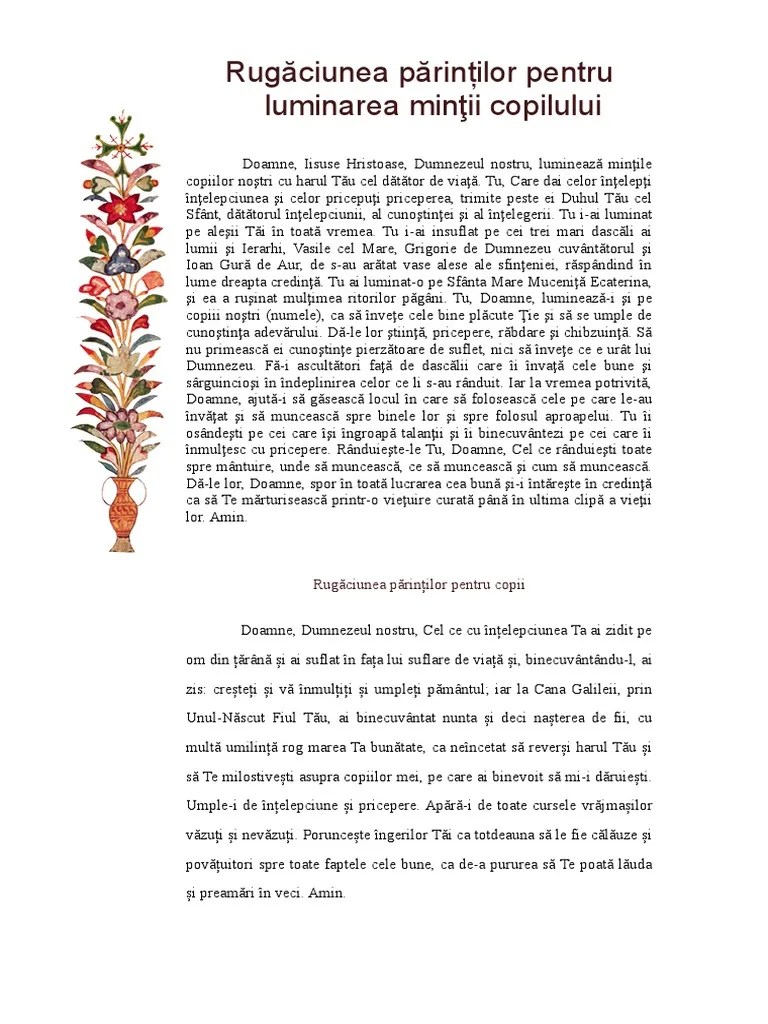 05.05.2014 · tu, cel ce te‑ai arătat fetiţei pe care ai îndemnat‑o să se spovedească, îndeamnă‑i şi pe copiii noştri să meargă pe calea spovedaniei. 28.07.2017 · rugaciunea parintilor pentru binecuvantarea copiilor. Creșteți și vă înmulțiți și umpleți pământul; Doamne iisus hristoase, fiul lui dumnezeu, binecuvanteaza, sfinteste, ocroteste pe acest copil al meu cu puterea facatoare de viata a crucii tale. Ne rugăm ţie, sfinte efrem. Doamne iisus hristoase, fiul lui dumnezeu, binecuvanteaza, sfinteste, ocroteste pe acest copil al meu cu puterea facatoare de viata a crucii tale. 26.11.2012 · rugaciunea parintilor pentru binecuvantarea copiilor. Tu ne‑ai învăţat că sfânta împărtăşanie este cel mai mare ajutor pentru copii, pentru aceasta ajută‑i pe aceştia să trăiască o viaţă curată, pentru a primi fără osândă sfintele taine. 19.06.2017 · rugăciunea părinților pentru copiii aflați în călătorie.. 19.06.2017 · rugăciunea părinților pentru copiii aflați în călătorie.