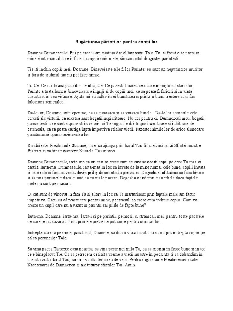 "cresteti si va inmultiti si umpleti pamantul," iar in cana galileii, prin unul nascut fiul tau, ai binecuvantat nunta si, nasterea de fii, cu multa umilinta rog marea ta bunatate, ca neincetat sa reversi harul tau si sa te milostivesti asupra copiilor mei, pe care … Rugăciunea părinţilor pentru fiii lor. Credința este cea care ne dă speranță și putere pentru a trece peste cele mai dificile perioade.. 05.05.2014 · tu, cel ce te‑ai arătat fetiţei pe care ai îndemnat‑o să se spovedească, îndeamnă‑i şi pe copiii noştri să meargă pe calea spovedaniei.