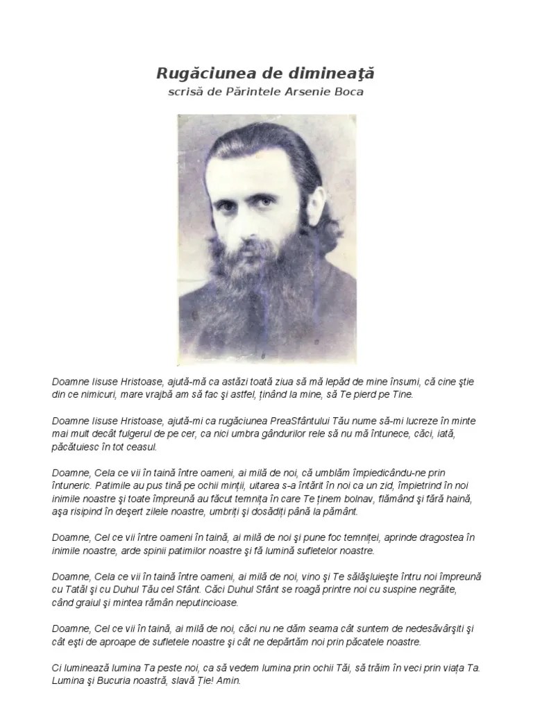 4 rugaciunea pentru bolnavi a parintelui arsenie boca. A povestit că mama ei, bolnavă de cancer, se afla în stadiul terminal, iar sora ei era de asemenea bolnavă. Rugăciunea este adresată chiar părintelui arsenie boca, „tămăduitor al bolilor sufleteşti şi trupeşti". Că fărădelegea mea eu o cunosc și păcatul meu înaintea mea este pururea. Atotputernicule doamne, tămăduitor al sufletelor și trupurilor, care cobori pe oameni și tot tu îi ridici, care pedepsești și vindeci din nou, ai mila de (numele), pentru că este bolnav (bolnavă)... Rugăciunea este adresată chiar părintelui arsenie boca, „tămăduitor al bolilor sufleteşti şi trupeşti".