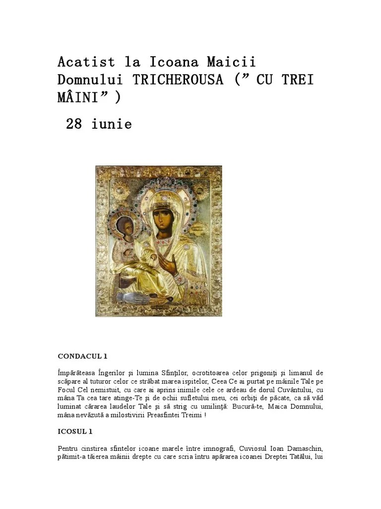 Pe stâlpul minţii noastre închipuie, cuvintele înţelepciunii cereşti, ceea ce eşti stâlpul rugăciunii care toată lumea o sprijineşti.. May 19, 2017 · sa aveti mare evlavie, fratilor, la fecioara maria si fericita este casa si familia aceea care are in casa icoana maicii domnului si in fiecare dimineata ii citeste acatistul si cinstitul ei paraclis si toti stiu rugaciuni catre maica domnului.. Nu ne lispi pe noi de ocrotirea ta de maică, ceea ce eşti mângâierea celor împovăraţi de păcate, floarea tuturor.